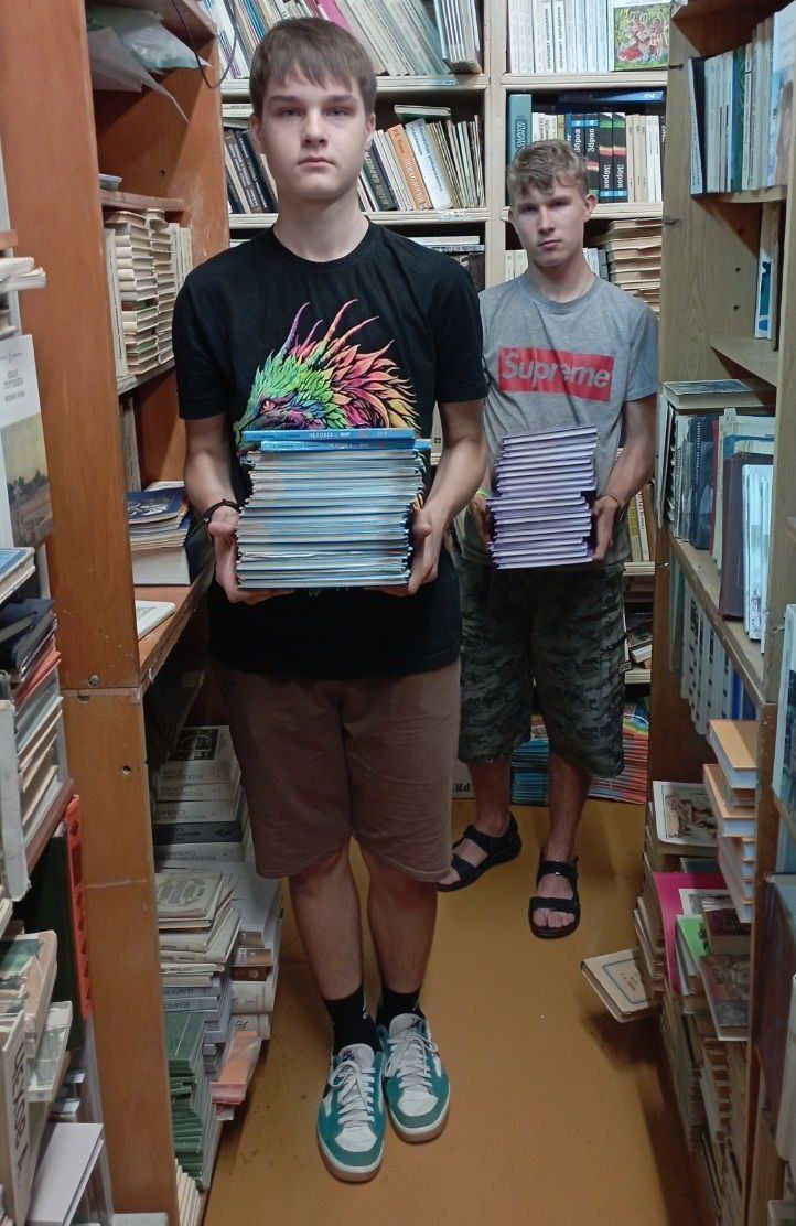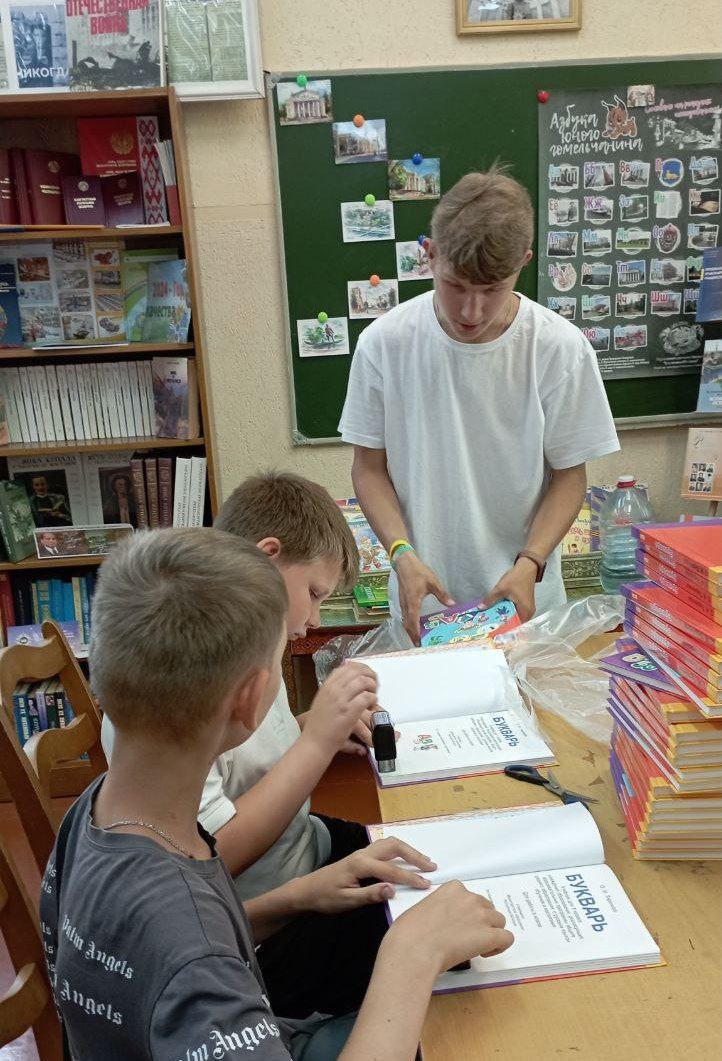 Вместе с педагогами ребята маркировали, сортировали и закладывали в хранилище библиотеки школы учебники к новому учебному году.