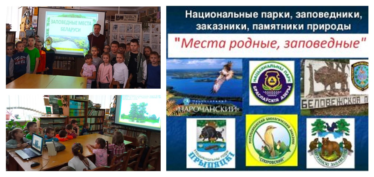С помощью мультимедийной презентации ребята познакомились с основными заповедниками и национальными парками Республики Беларусь. Заповедники и национальные парки являются особо охраняемыми природными территориями, что позволяет уберечь от гибели часть дикой природы и животного мира. Наслаждаясь чудесными пейзажами, ребята получили возможность заочно посетить интереснейшие места и окунуться в особую атмосферу с неповторимым колоритом и давними традициями, с которыми, без сомнения, им было интересно соприкоснуться.