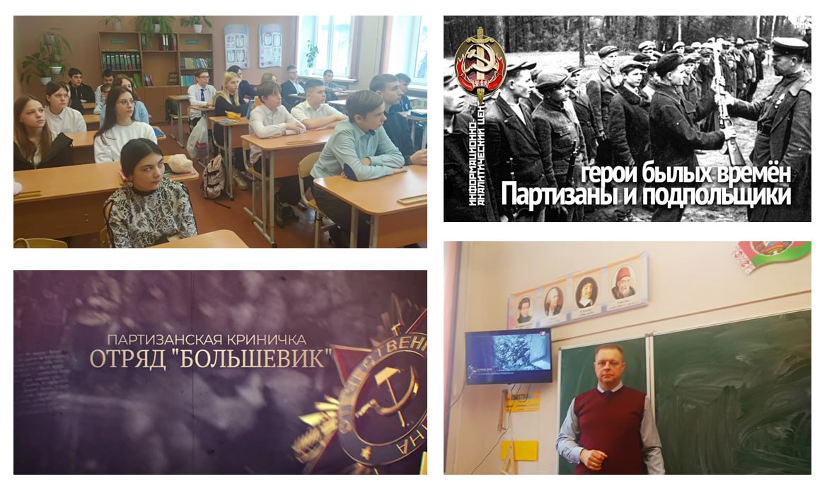 О героях-подпольщиках Гомельщины, об истории образования и боевом пути партизанского отряда "Большевик", рассказал ребятам руководитель по военно-патриотическому воспитанию. Также вниманию учащихся был представлен документальный фильм телерадиокомпании Гомель "Партизанская криничка. Отряд "Большевик".