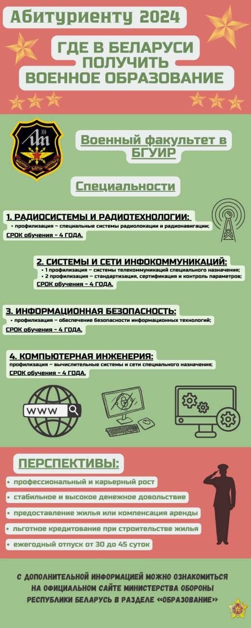 ⭐️За годы обучения на военном факультете в БГУИР курсанты приобретут знания и навыки, которые позволят им реализовать себя в области разработки, проектирования и эксплуатации систем и программного обеспечения различного назначения, в том числе и военного.