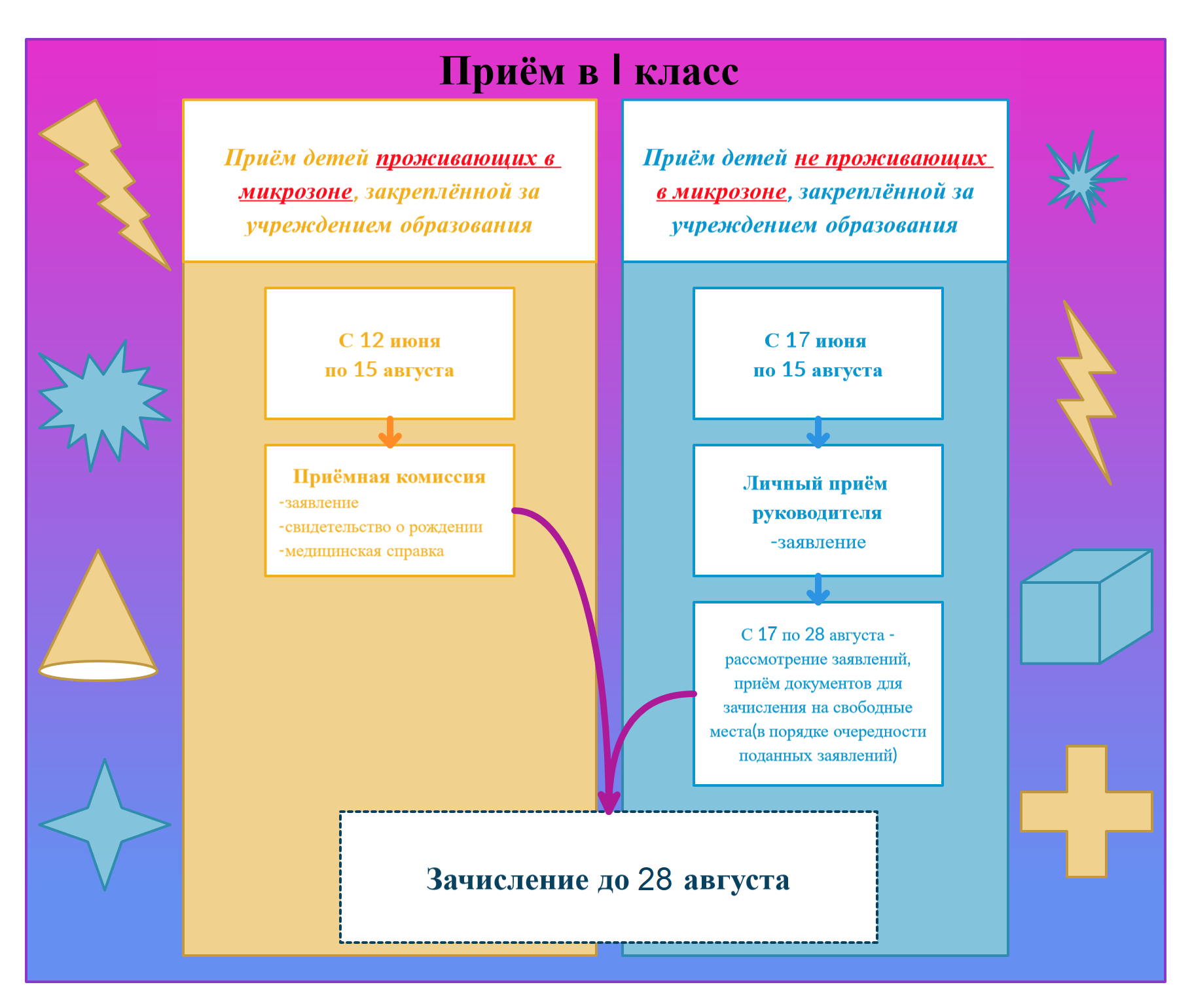 Сроки приема документов для зачисления детей в I класс: с 12 июня по 15 августа года приема, на свободные места (при наличии) – до 28 августа года приема;